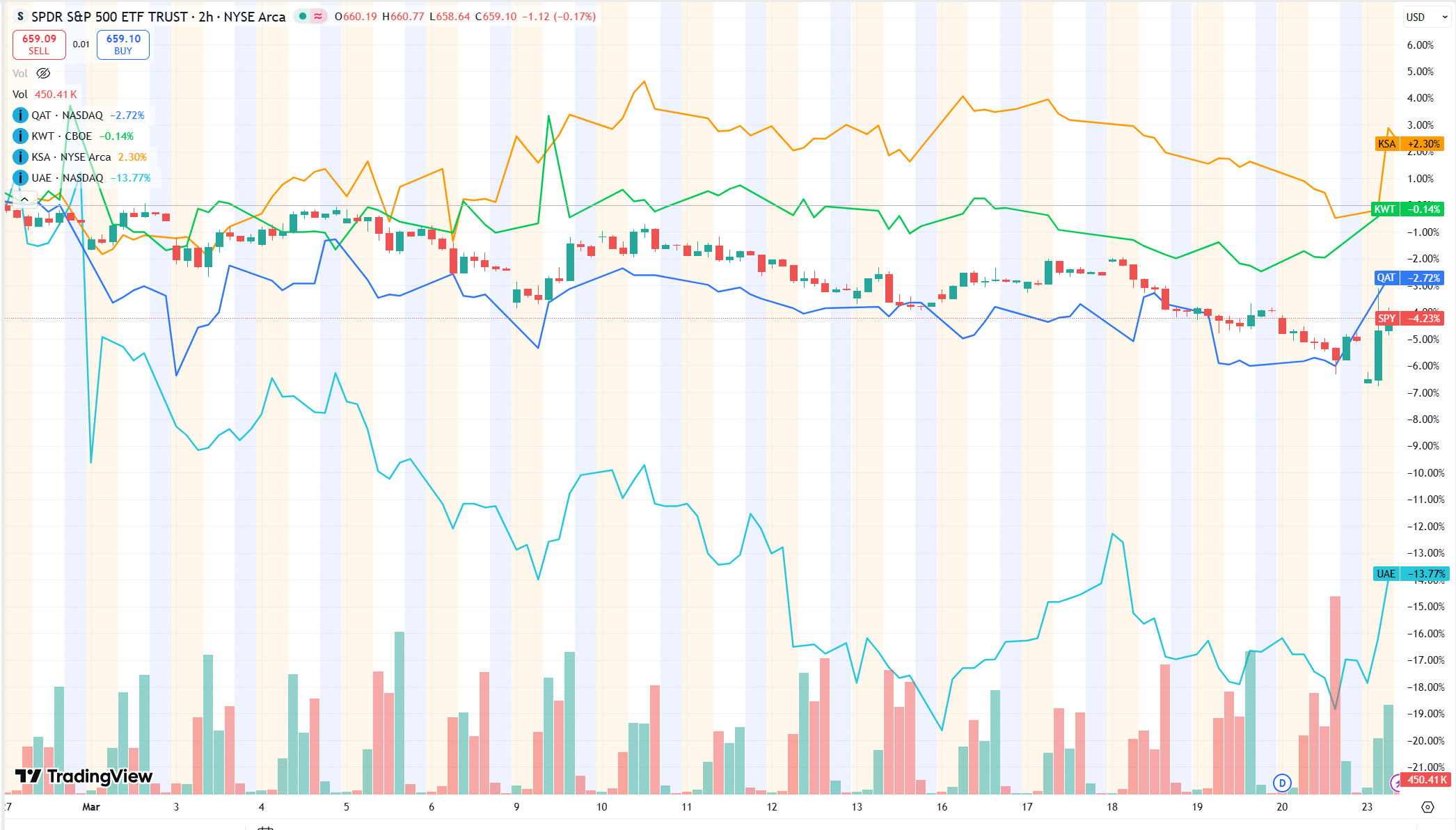 The UAE ETF has declined sharply by –13.77%, significantly underperforming the SPDR S&P 500 ETF Trust, which is down –4.23% over the same period. Qatar has fallen –2.72%, Kuwait is nearly flat at –0.14%, while Saudi Arabia stands out with a gain of +2.3%.