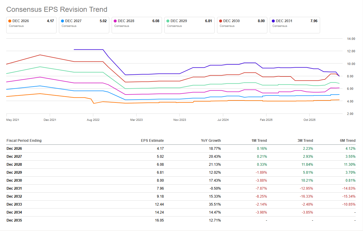 The disconnect between the narrative and the fundamental reality is clearly visible in the consensus EPS data, which directly refutes the “secular decay” thesis priced into the stock. Instead of fading, growth is ramping up.