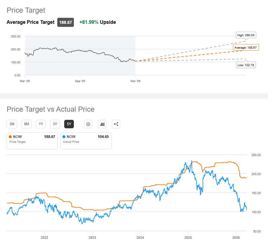 Because Service Now is a mega-cap stock trading at roughly a $130 billion valuation, its aggressive growth projections aren’t just hopeful guesses – they are heavily scrutinized and vetted by Wall Street. Looking at their targets, the absolute lowest, most pessimistic estimate on the Street is $122.