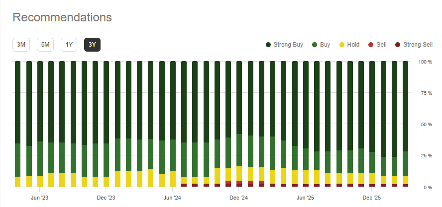 This institutional confidence is mirrored by Wall Street analysts, who have consistently maintained over 70-75% “Buy” and “Strong Buy” ratings over the last three years, even through the absolute peak of the AI panic.