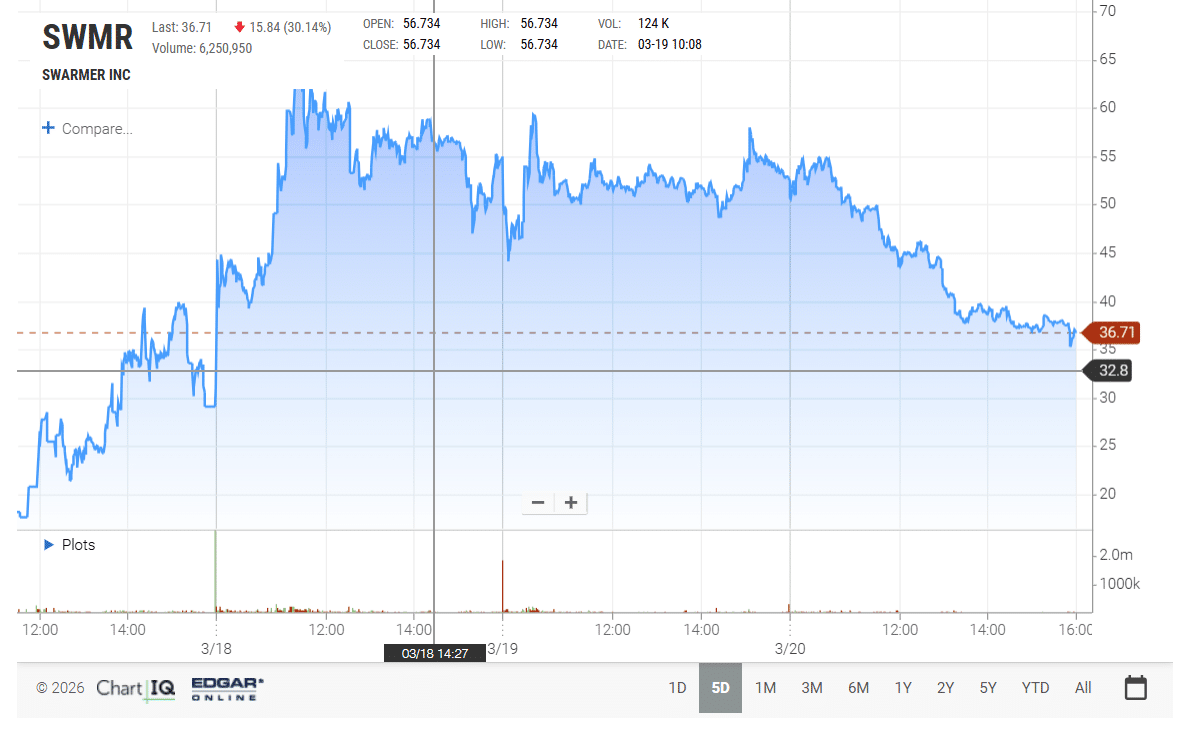 On March 17, 2026, Swarmer, Inc. (Nasdaq: SWMR) made its Nasdaq IPO debut at $5.00 per share. Four trading sessions later, the stock had touched $65.04, retraced to $36.71, and left the market asking a question no standard valuation model can answer cleanly: what just happened?
