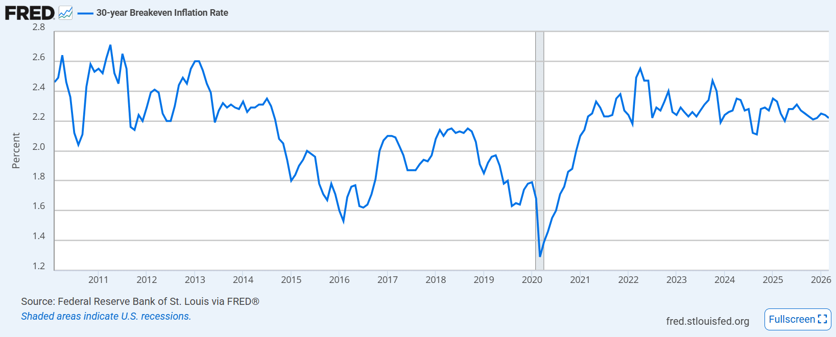 Somewhat surprisingly, the answer is no. Markets do not expect runaway inflation. Instead, they imply roughly 2.2% annual inflation over the long term. That level broadly matches expectations from the early 2010s. Long-term inflation expectations have stayed relatively stable over the past several years, clustering around that figure.