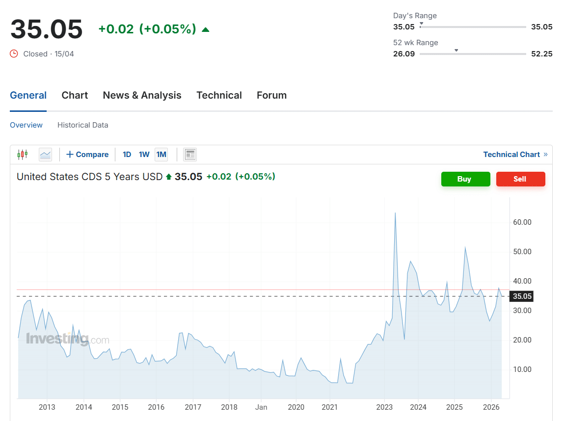 CDS markets broadly track the dynamics of the debt/GDP ratio. However, current pricing tells a different story. Insurance on US sovereign debt costs around 0.35% per annum on the notional amount. That figure suggests the probability of a US default remains largely theoretical. CDS dealers also report very limited demand for this protection. Global CDS notional outstanding totals roughly USD 30 trillion, yet only USD 3–4 billion links to US sovereign risk.