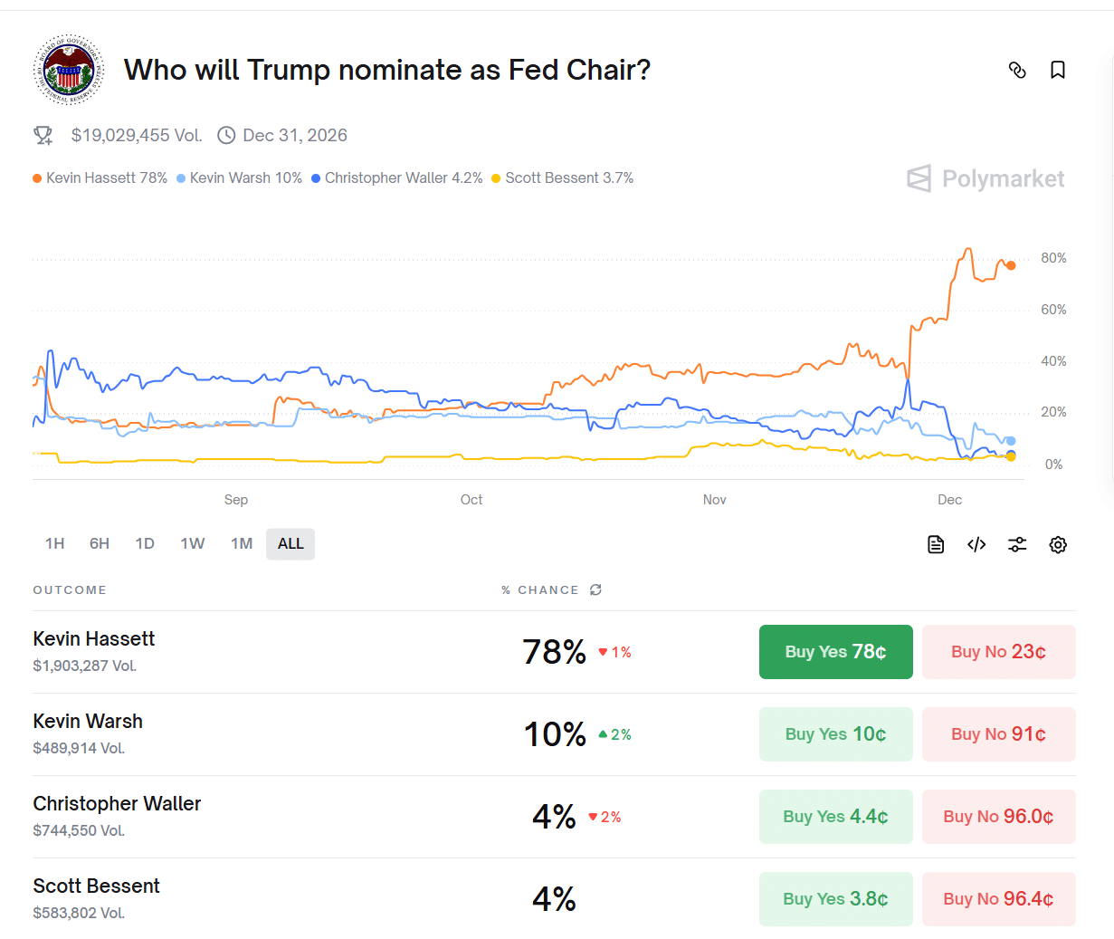 Since late November, one candidate has surged with oddsmakers: Kevin Hassett. The current odds — 78% for Hassett, 10% for Kevin Warsh, 4% for Christopher Waller, and 4% for Scott Bessent — suggest that one of these four will likely become the next Chairman, with Mr. Hassett leading for now.